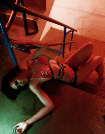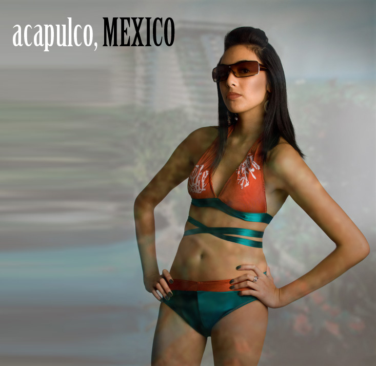 A. Acapulco halter bikini top with embroidered coral branch accents. Contrast ties crisscross torso. Matching full-coverage bikini bottom.